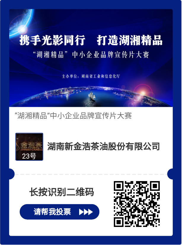 由湖南工業和信息化廳舉辦的“湖湘精品”中小企業宣傳片大賽火熱進行中。大賽以“攜手光影同行,打造湖湘精品”為主題,通過面向國家和省、市級專精特新“小巨人”企業征集、評比的形式,力求引導中小企業追求卓越品質,夯實品牌基礎、加強品牌培育、深化品牌傳播,提升品牌綜合競爭力,打造一批“記得住、叫得響、走得出”的“湖湘精品”品牌。![]() 金浩茶油(湖南新金浩茶油股份有限公司)作為茶油行業領導品牌、農業產業化國家重點龍頭企業,受邀參加此次宣傳片大賽,參賽編號23。請支持我們的朋友動動金手指,幫忙投下票。微信掃描進入投票界面,選擇23號金浩茶油,每個微信號每天可以投5票,可以投給同一個選手哦~ 投票時間:2021.06.23-2021.06.29 |