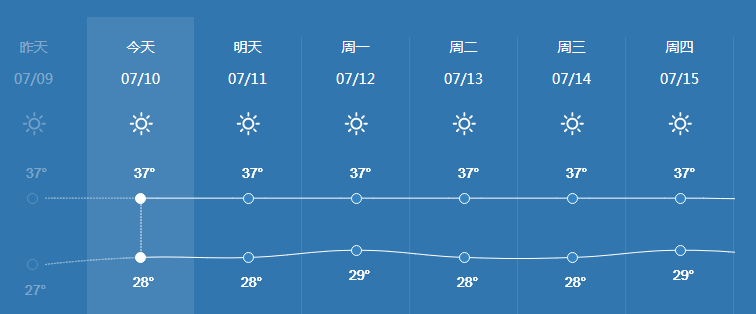 長沙可謂“滿屏盡是陽光” 陽光不僅天天露臉,而且還帶著氣溫持續攀高。高溫預警信息被接連拉響,省、市氣象部門提醒,未來一周每日最高氣溫都在37℃左右!
