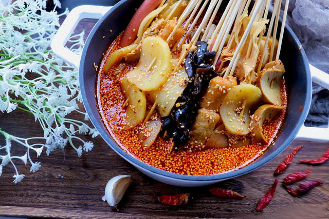 ?竹簽用熱水消毒,控干水分,蓮菜、土豆、火鍋丸子等食材串在竹簽上。 ?串好的蔬菜串放入沸水中燙一下。 ?簡易雞湯:先把雞肉放到開水鍋里焯出血沫,然后把雞肉和骨頭拆開。雞骨頭重新放到湯鍋,加入姜片和蔥結,倒入開水,中火燉上30分鐘,只留湯。 ?底料:炒鍋倒油燒熱,放入紅辣椒,香葉,花椒,蔥段,蒜瓣和姜片,炒出香味,加入2大勺的郫縣豆瓣醬和2大勺辣椒油炒勻(視個人口味增減)。 ?把雞湯倒進去燒開,再將之前已經燙熟的蔬菜串和雞肉串一起放入底湯里,泡上15分鐘讓其入味?!綯IPS:靜置3個小時會更入味,能過夜后用口感最佳】