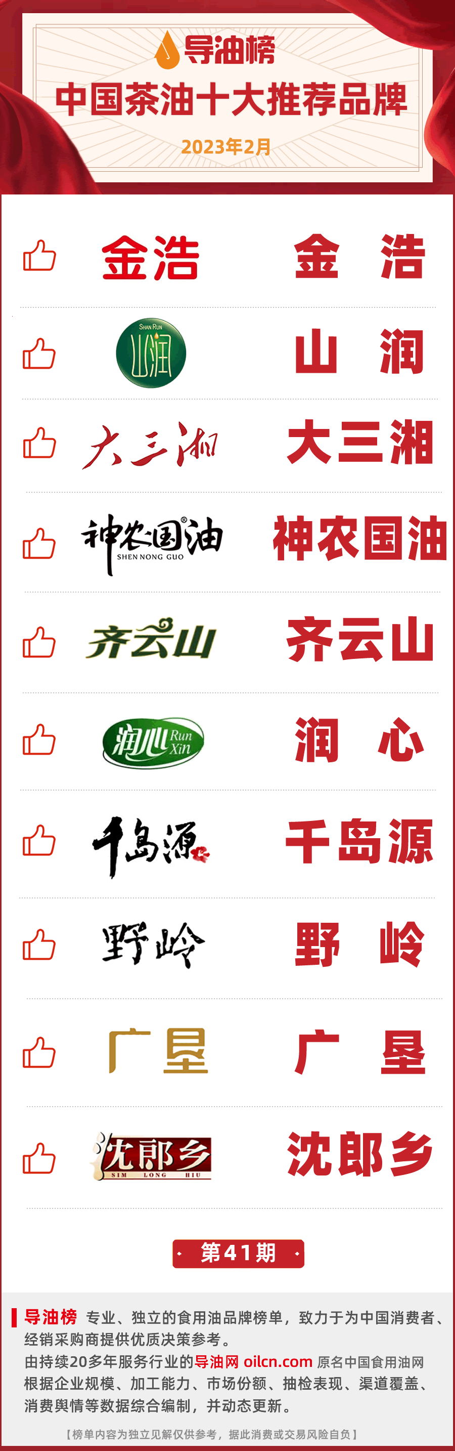 什么牌子的茶油好?根據(jù)企業(yè)加工實力、市場占有率、品牌知名度、行業(yè)影響力等指標(biāo),本期導(dǎo)油榜為您推薦十大品牌: