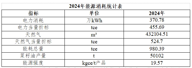 1、水資源管理 2024 年,公司市政供水取水量 44058m³,廢水排放量 35264.6m³,單位產品取水量 0.88m³/t,優于湖南省《用水定額 第 2 部分:工業》(DB43/T 388.2-2025)中菜油 “先進值 2.7m³/t” 標準,通過水循環系統實現冷卻水回用率達 80%。 2、能源消耗控制 ![]()