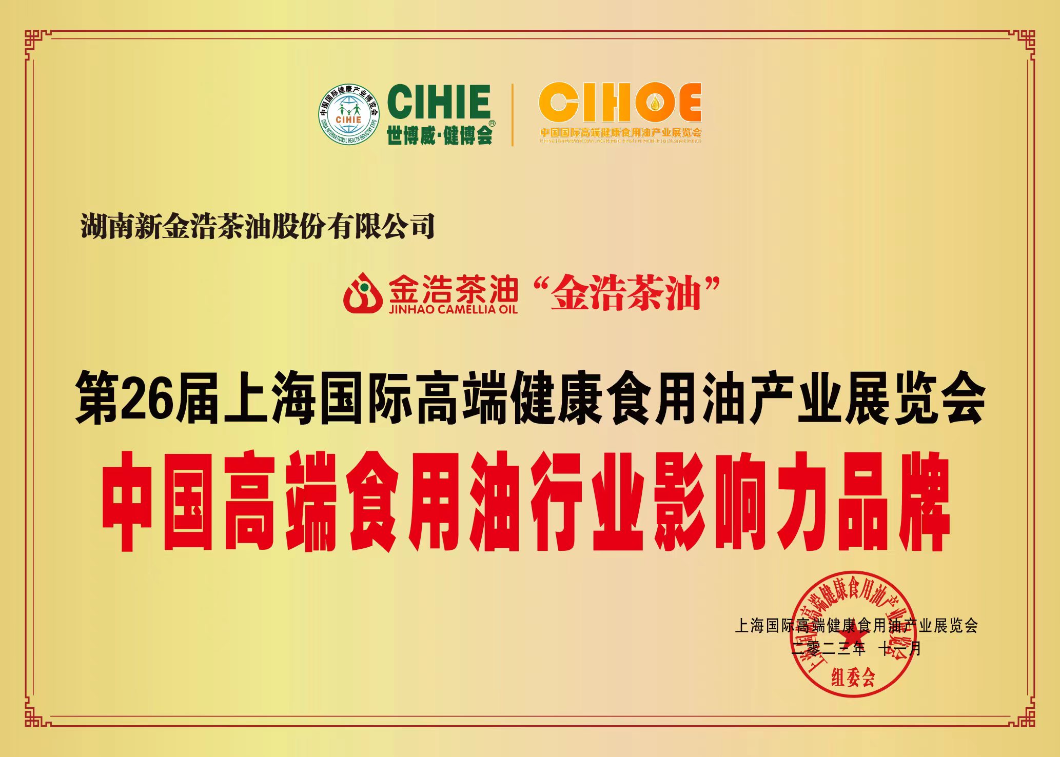 近日,金浩茶油在獲得第二十四屆“中部農博會金獎”后,再度傳來喜報,接連斬獲第26屆上海國際高端健康食用油產業展覽會“中國高端食用油行業影響力品牌”與湖南省消費品工業“三品”標桿企業稱號。