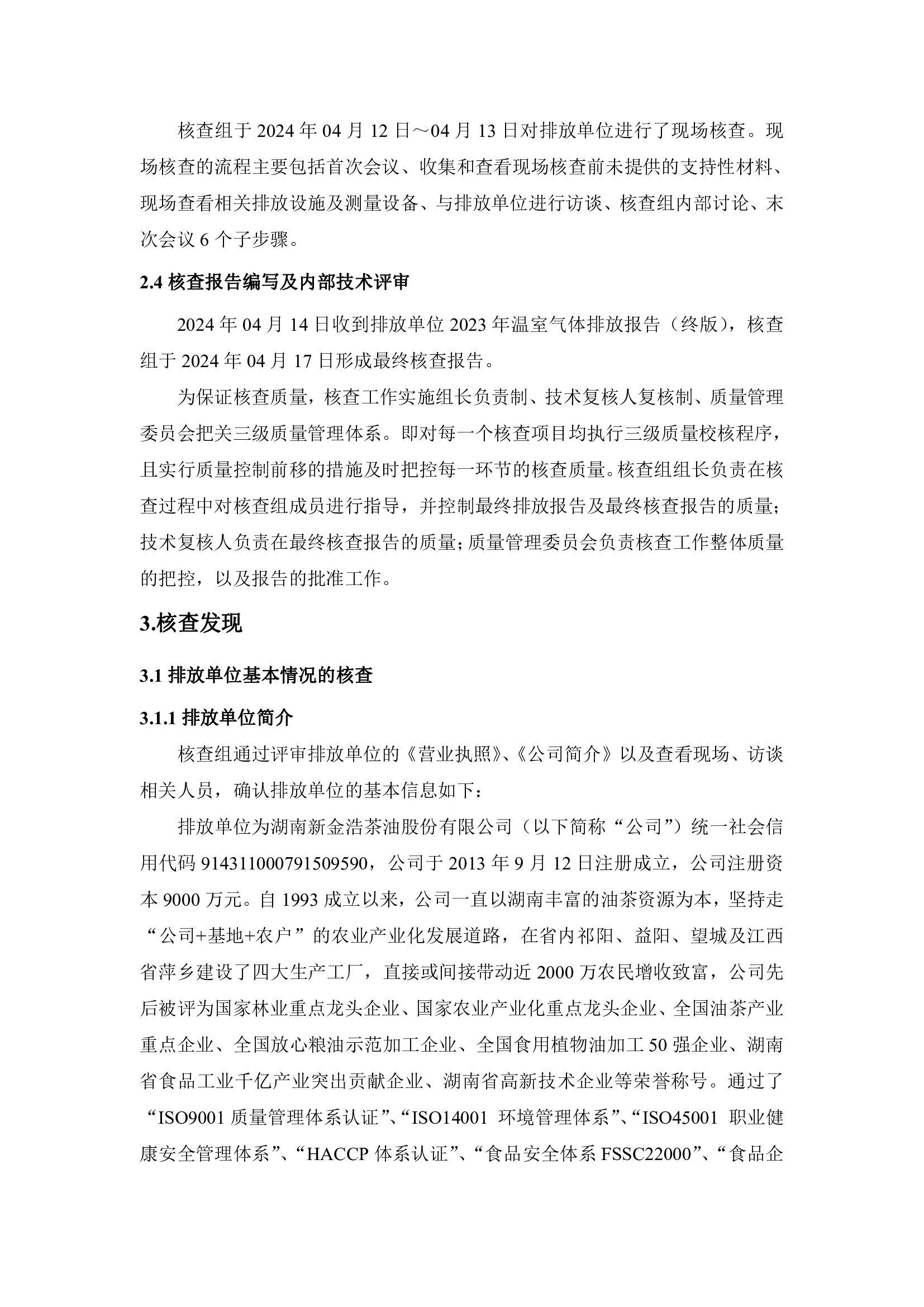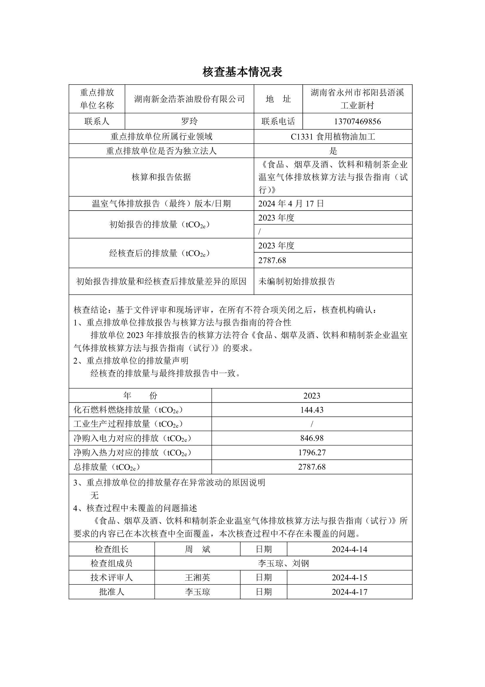 湖南新金浩茶油股份有限公司2023年度溫室氣體排放核查報告。